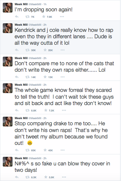 HomeFeatureFOOLERY: Meek Mill vs. Drake Beef Ms. Bels Wednesday, July 22, 2015 Feature, Music, The Studio Last night’s Twitter and Instagram activity was off-the-chain after rapper Meek Mill decided to go on this unexpected rant. What spawned Meek to snap, some speculated that it had something to Drake not tweeting the link to his latest album, Dreams Worth More Than Money. But later in the wee hours of the morning, it was revealed (via Karen Civil) that Meek was pissed after Drake didn’t show up to his homecoming concert in Philly. The foolish part about Meek’s emotional breakdown is that he claimed Drake didn’t write his own raps. He tweeted the name Quentin Miller. Apparently, this guy is an Atlanta native and is responsible for writing Drake’s verse on “R.I.C.O.” What most lurkers, especially those who stan for the 6 God, is that Drake’s preference to use ghostwriters is nothing new. That rumor about Drake has been around for several years. So, Meek probably thought is was putting Drizzy on blast, but instead made himself look foolish. NO ONE REALLY CARES IF DRAKE DOESN’T WRITE HIS OWN RAPS! At least I don’t. Diddy, Beyonce…hell even Meek’s boo Nicki Minaj has had her ex-Safaree write bars on an album or two. So, if Meek is going to call people out, call out everybody. IJS… What’s going to be interesting is how Drake will respond. I suspect that he’ll respond via record, of which he will have written on his own. LOL And that song will overshadow anything that Meek has done lately. Sorry not sorry. In my opinion, Drake is better at what he do. That’s why he’s in his own lane and selling millions of records. And NO, I’m not a Drake stan. I’m just a lover of hip-hop and music in general. Meek Mill is talented too. However, he comes from a different world than Drake. Therefore his music is much more grimy and street-influenced. I like Meek’s energy but somethings are best left unsaid. Yeah, the Twitter rant may show you got balls, however, this showed that Meek has one ball because he half-assed the rant. Like I said, if you’re going to put people on blast and insinuate that you will “call out” other rappers too, THEN DO THAT! Go hard or go home…