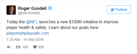NFL Commissioner Roger Goodell has announced that the league will commit $100 million toward medical research and engineering advancements to help prevent, diagnose and treat head injuries. The NFL and various partners have spent money on medical neuroscience research. Also, $40 million, of the $100 million, will be spent over the next five years on research. “The NFL has been a leader on health and safety in many ways, and we’ve made some real strides in recent years,” Goodell wrote in an open letter to announce the league’s “Play Smart. Play Safe” initiative. “But when it comes to addressing head injuries in our game, I’m not satisfied, and neither are the owners of the NFL’s 32 clubs. We can and will do better.” “The goal is to pursue scientific research to examine the long-term effects of concussion, the incidence and prevalence of chronic traumatic encephalopathy (CTE) and what can be done to improve long-term player health,” Goodell wrote. “This includes investing in research to explore new and effective ways to treat concussions.” For more information on the initiative, visit www.playsmartplaysafe.com. Source: LA Times Photo credit: FootballScoop.com/Alex Goodlett/Getty Images