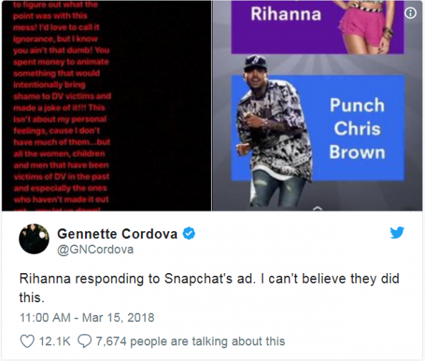 Rihanna posted a well-deserved clapback at Snapchat for an offensive advertisement on domestic violence. The social media app posted a game ad that asked users would they “rather slap Rihanna or punch Chris Brown.” Social media users took offense to the question, which made light of the 2009 assault case between Brown and Rihanna. “Now SNAPCHAT I know you already know you ain’t my fav app out there,” Rihanna wrote. “But I’m just trying to figure out what the point was with this mess! I’d love to call it ignorance, but I know you ain’t that dumb!” Rihanna continued her message focusing on those who have and remains in situations where abuse is prevalant. “You spent money to animate something that would intentionally bring shame to DV victims and made a joke of it,” the “Wild Thoughts”-singer wrote. “This isn’t about my personal feelings, cause I don’t have much of them…but all the women, children, and men that have been victims of DV in the past and especially the ones who haven’t made it out yet…you let us down! Shame on you. Throw the whole app-oligy away.” Although Snap Inc. eventually took the advertisement down, activist like Brittany Packnett is concerned how an ad like this is approved in the first place. “I know that social media ads go through an approval process from the platform. This means @Snapchat approved an ad that makes light of domestic violence. The update ain’t the only thing that’s wack over there, friends.” In a statement to BBC News, Snap Inc. apologized. “The advert was reviewed and approved in error, as it violates our advertising guidelines,” Snap wrote. “We immediately removed the ad last weekend, once we became aware. We are sorry that this happened.” Snap Inc need to get it together…